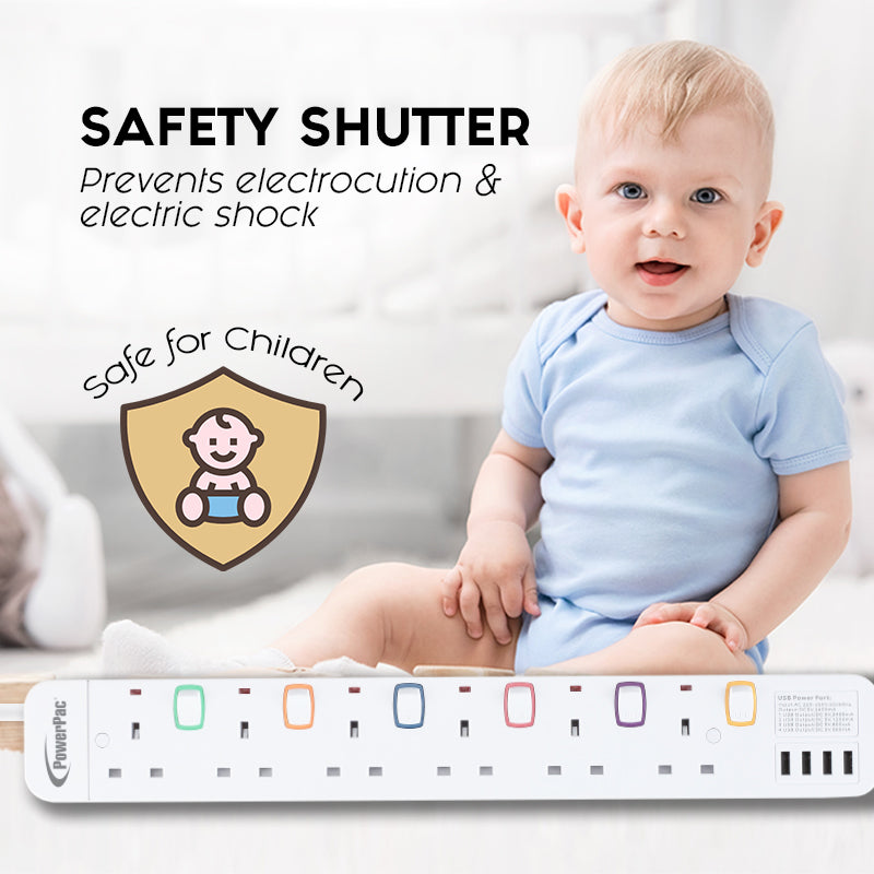 It has 3 important safety features: Built-in Surge Protector safeguards electronic devices such as your TV system or computer from high-voltage power surges; while Safety Shutter prevents children from tampering with the device. All materials are Fire-retardant.