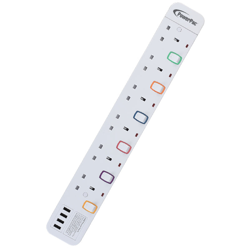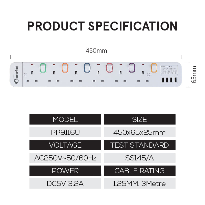 The Safety Extension Sockets in this range, all in white, comprises power cable lengths of 3 m, and is equipped with 3, 4, 5 or 6 electrical sockets plus 4 built-in USB Sockets with 3.2A on the powerboard. This model, PP9116U, comes with 6 electrical sockets. With 2-Pin direct, inserting 2-Pin plugs into the sockets no longer require any plastic adapters.
