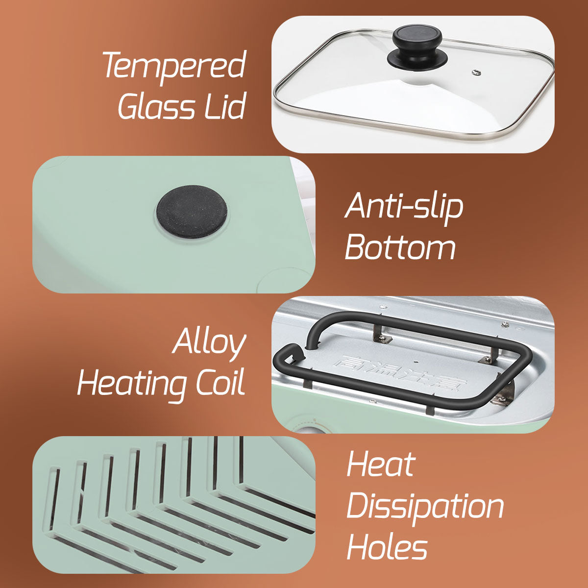 It possesses the following features: a removable power cable for convenience, a removable stainless steel Inner Pot with non-stick coat which can hold a wide variety of food items, and a removable stainless steel Grill Plate with non-stick coat which can grill food items similar to a BBQ grill. Its safety features include auto-shut off function which automatically shuts off power when the temperature rises above a threshold limit.