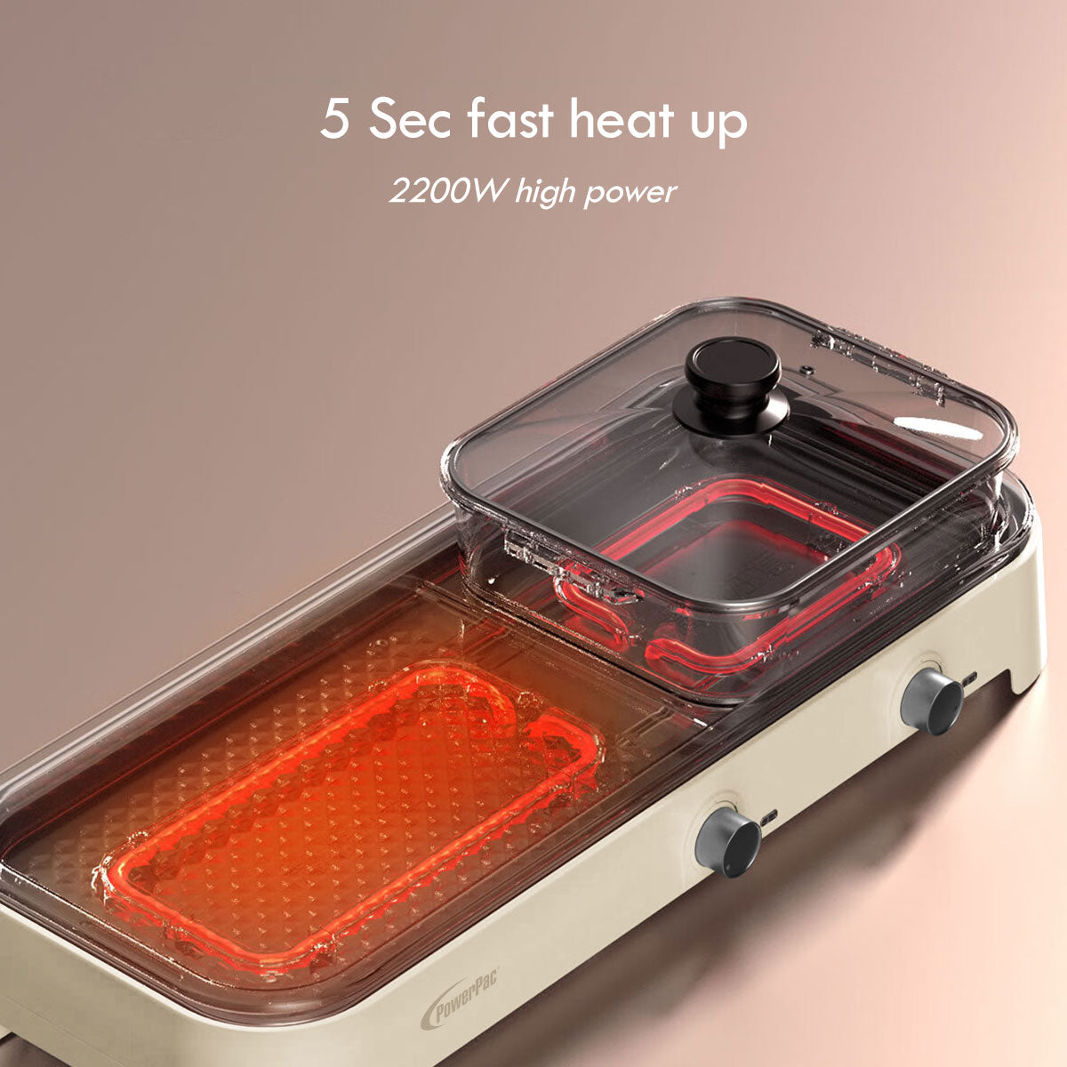 The PowerPac Steamboat with BBQ Grill, 2 in 1 Multi-Cooker YuanYang pot PPMC797 carries out the cooking functions of many appliances all within one versatile and time-saving tabletop electric appliance, freeing up your modern kitchen's already limited space.