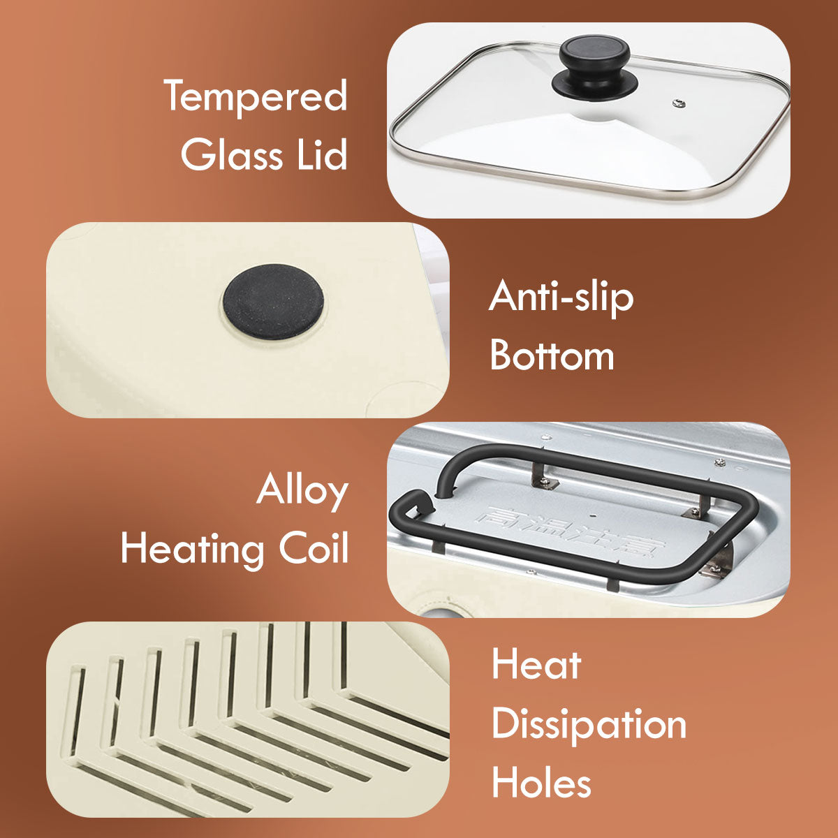 It possesses the following features: a removable power cable for convenience, a removable stainless steel Inner Pot with non-stick coat which can hold a wide variety of food items, and a removable stainless steel Grill Plate with non-stick coat which can grill food items similar to a BBQ grill. Its safety features include auto-shut off function which automatically shuts off power when the temperature rises above a threshold limit.