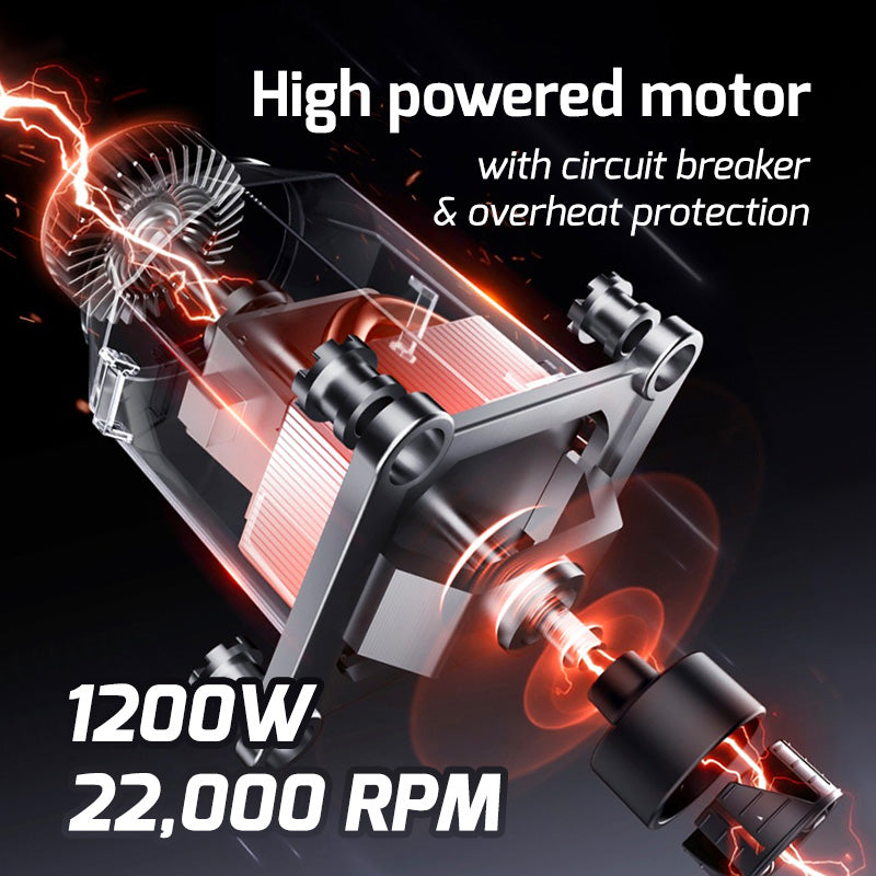 The ON/OFF & Speed Rotary Knob has a continual range of speeds between Min and Max and a Pulse Button, which increases the power even further and can be used to clear blockages instantly!