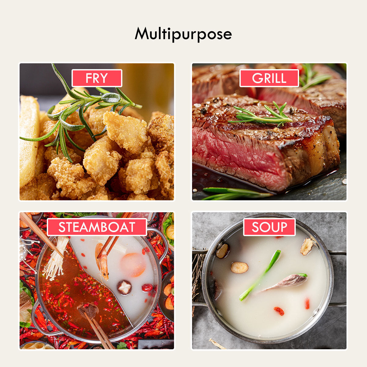 Suitable for iron, aluminium, copper, ceramic, marmite, heat-resistant glass and any other heat-resistant cookware.