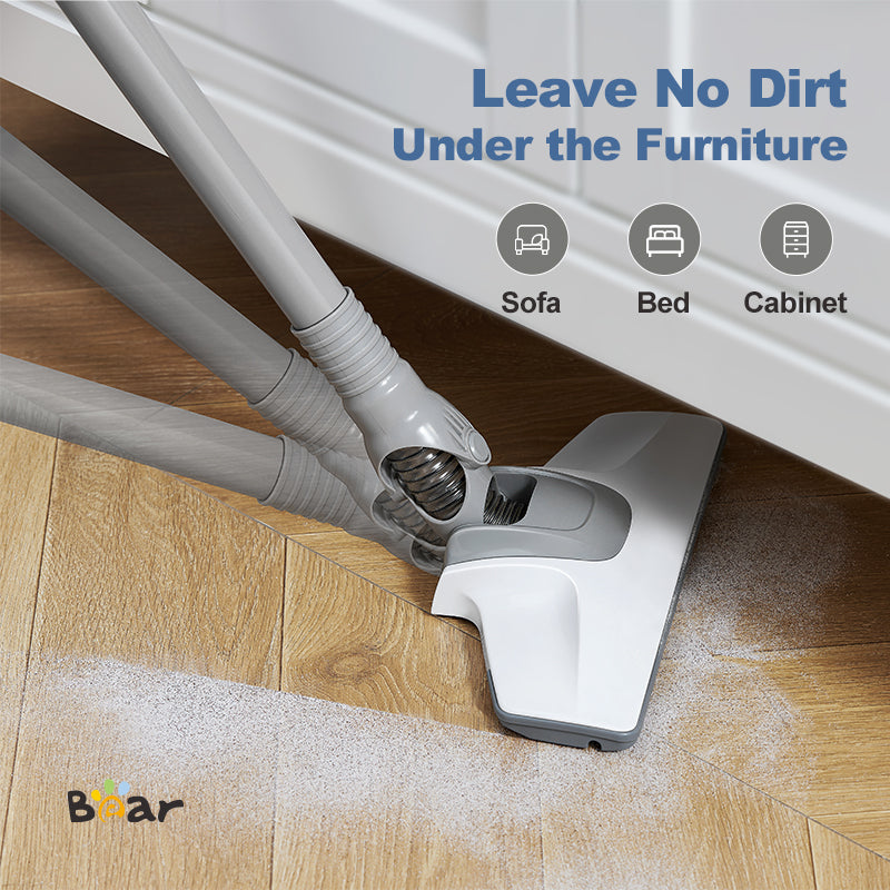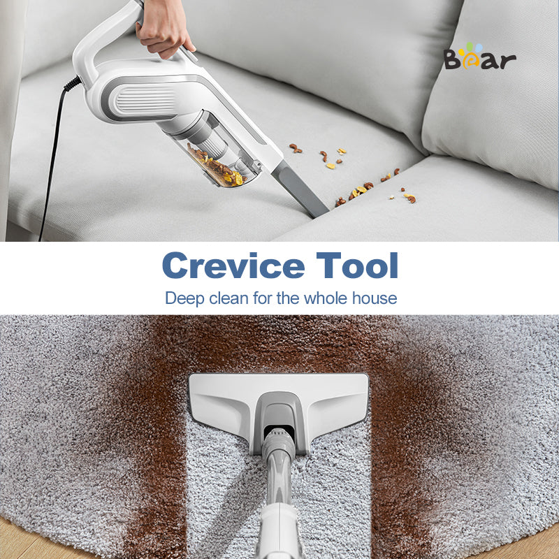 The Bear Stick Vacuum Cleaner Handheld Powerful with Dual Hose/Usage XCQ-P06J5 can be used as a normal vacuum cleaner with the Extension Tube holding the Floor Brush or Long Crevice. Vacuuming is a breeze, with the Floor Brush swivelling effortlessly as it deftly removes dirt in its wake, on hard floors, wooden floors and carpets and curtains alike. Used without the Extension Tube, with the Floor Brush or Long Crevice directly inserted into the Suction Head, it transforms into a powerful hand-held device removing dust and even Dust Mites from bedsheets, pillow cases, sofa covers, cushion covers, curtains, etc., all the while emitting noise lower than 72 dBa.