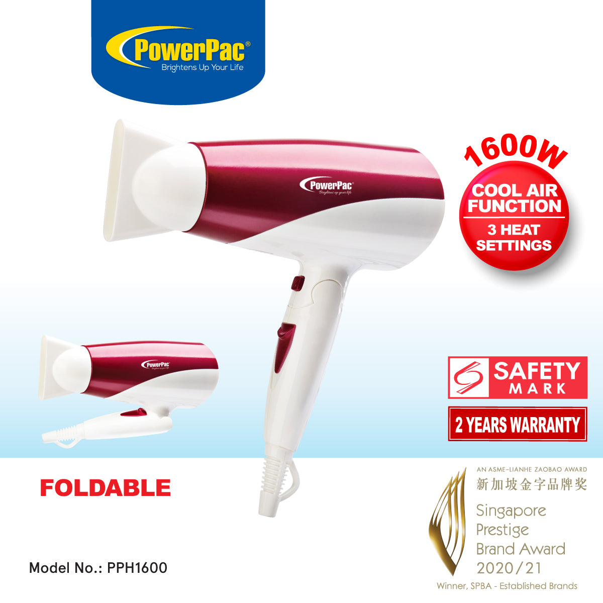 PowerPac Foldable Turbo Hair Dryer with Cool Air 1600W PPH1600 comes with 3 Speed control using 1600W, plus Turbo Boost for extra fast drying, courtesy of its powerful blades. Besides blowing hot air, it also comes with Cool Air function, which enables the body of the hair dryer to remain cool during operation. How convenient is that! With built-in Honeycomb Air Inlet so that air-circulation will be enhanced, it also emits low noise.