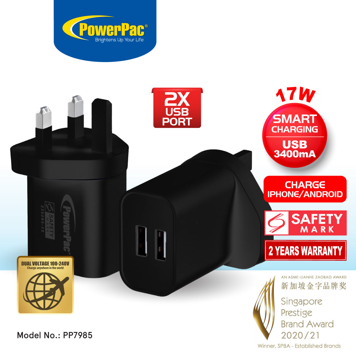 USB Smart Charger - 2 USB-A, Dual Voltage 100-240 AC, 17W, PP7985BK
