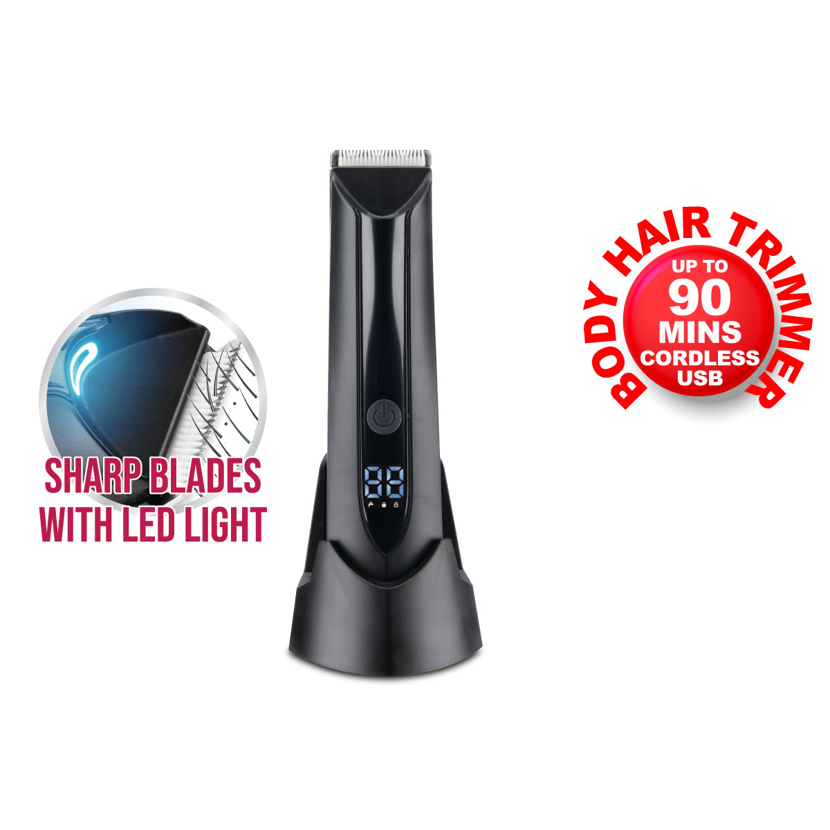 Safety and convenience are built into every detail. The USB-powered base allows charging from AC outlets, laptops, or power banks — perfect for on-the-go usage. The trimmer is water-resistant, letting you use or rinse it in damp conditions, while the integrated LED light helps you see stray hairs clearly. Whether in your bathroom, gym bag, or suitcase, you’re ready for care wherever life takes you.