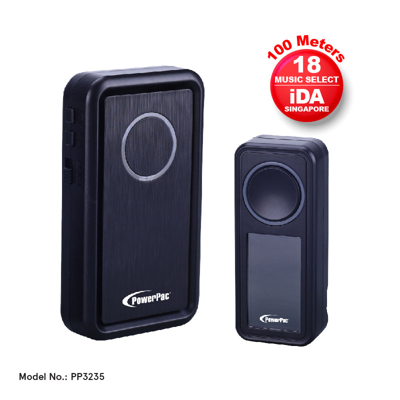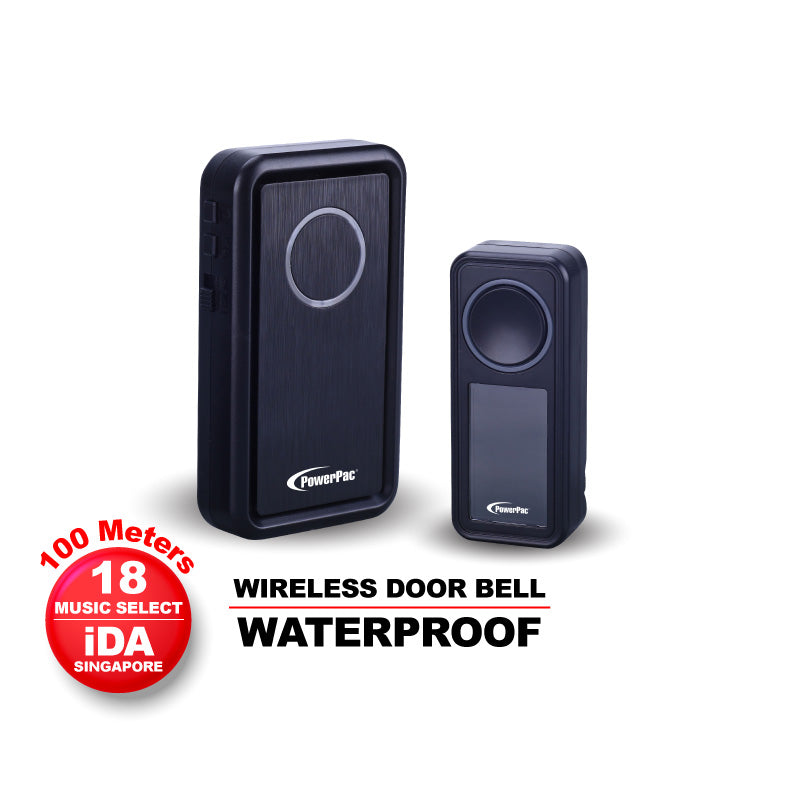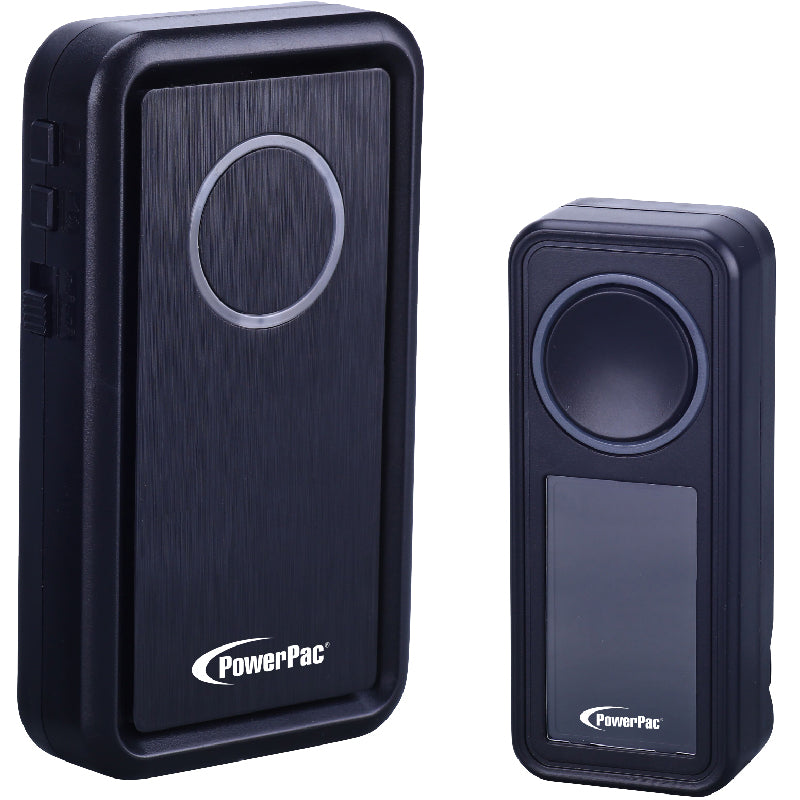 The PowerPac PP3236 Water-Proof Wireless Door Bell, Caller Bell with Volume Adjust & Tone Selector comprises a Transmitter and a Receiver, both of which are provided. It requires no drilling, no broadband or internet connection required and is completely portable.